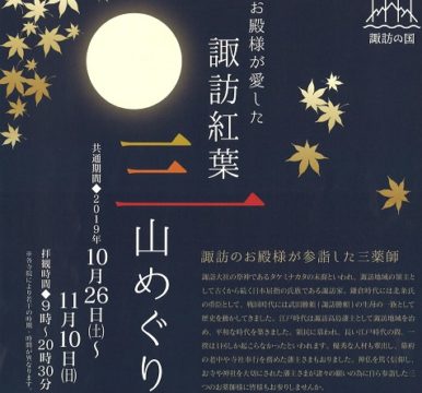 諏訪のお殿様が参拝した三薬師「佛法紹隆寺」「温泉寺」「長円寺」が連携して行う紅葉シーズンイベントのお知らせです。 各お寺でイベントに参加しながら異なる彩りの紅葉を拝殿できます。 イベント期間中は、ライトアップが行われるほ […]