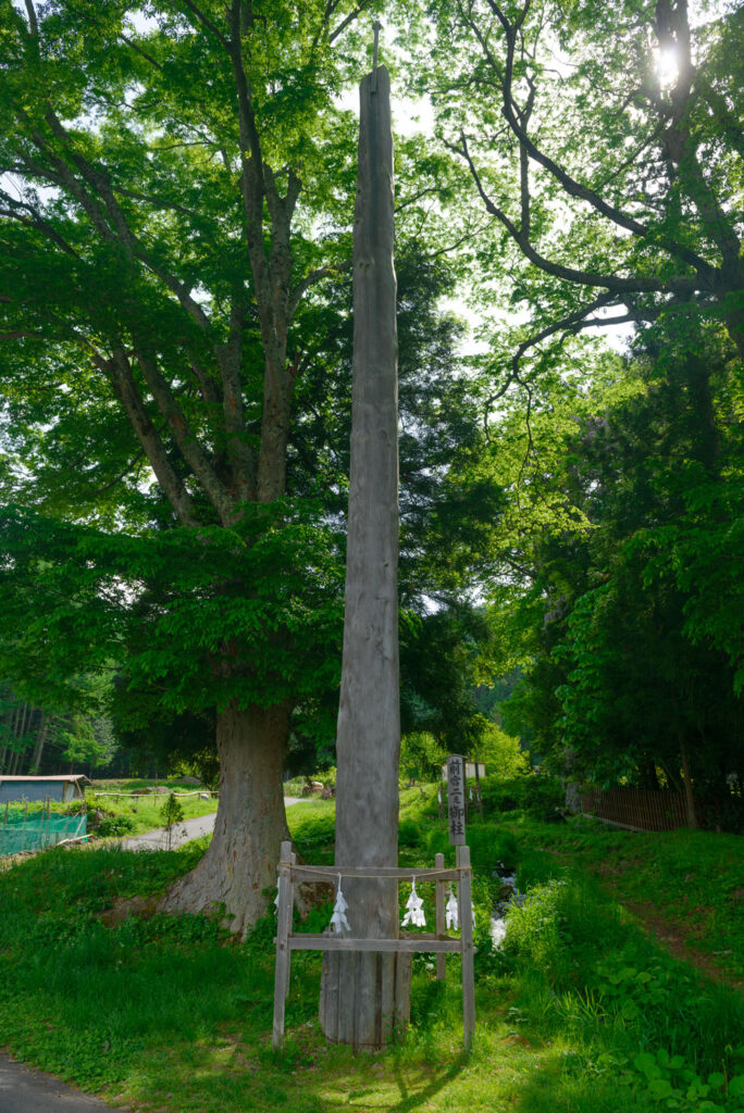 古きに囲まれた石段を登ると、山の中腹に現れる上社前宮は、諏訪信仰発祥の地と伝えられている。その昔は諏訪大社の祭祀を司る大祝の居館をはじめ、多くの建物によって構成されていた。本殿を取り囲むように建つ4本の御柱がよく見える。所在地:長野県茅野市宮川2030