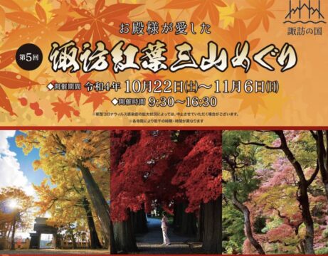 今年の秋は、諏訪のお殿様が諸々の願いのために参詣した三ヵ寺(「佛法紹隆寺」「温泉寺」「長圓寺」)のお薬師様へお参りしませんか。 お寺によって異なる彩りの紅葉を拝殿できます。 期間中、各お寺では、特別拝観やミニコンサート、 […]