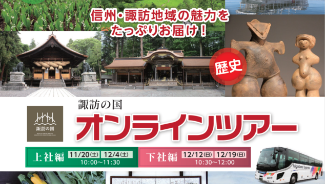 御柱祭が行われる諏訪はどんなところか? 信州・諏訪地域の魅力をオンラインツアーでたっぷりお届けします。 ご自宅にいながらご堪能ください 諏訪の国オンラインツアー 下社編 ~諏訪市・下諏訪町・岡谷市~ <日程> ・出発日 […]