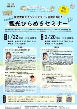 PDFファイル 令和3年度にに策定した諏訪市観光グランドデザインの実現に向けて、様々な視点から観光を学ぶための 観光ひらめきセミナーが2回に分けて開催されます。 第1回は1月22 […]