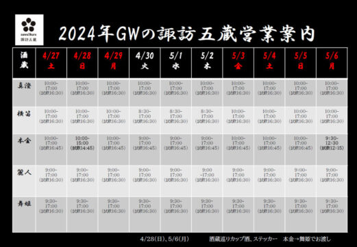 諏訪五蔵営業時間のご案内|2024年 ゴールデンウィーク