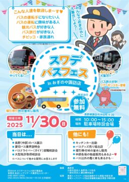 スワデ バスフェス🚌!!!2025年11月17日|By 諏訪観光協会 イベント詳細 日付: 2025年11月17 – 30日 カテゴリ: 2025, 11月 今、全国でバスの運転手さんが足りません! そこで11月30日(日)におぎのや諏訪店に県内外から、 十数台の観光バスが集結して 業界説明会、就職相談会を開催します。 バスグッズ販売や豪華賞品が当たる福引を実施、話題のゆるキャラも登場。 家族連れにも 楽しいイベントです。 参加無料!!! さぁ! 30日は是非、おぎのやに遊びに来てください!(中央道諏訪ICすぐです。)