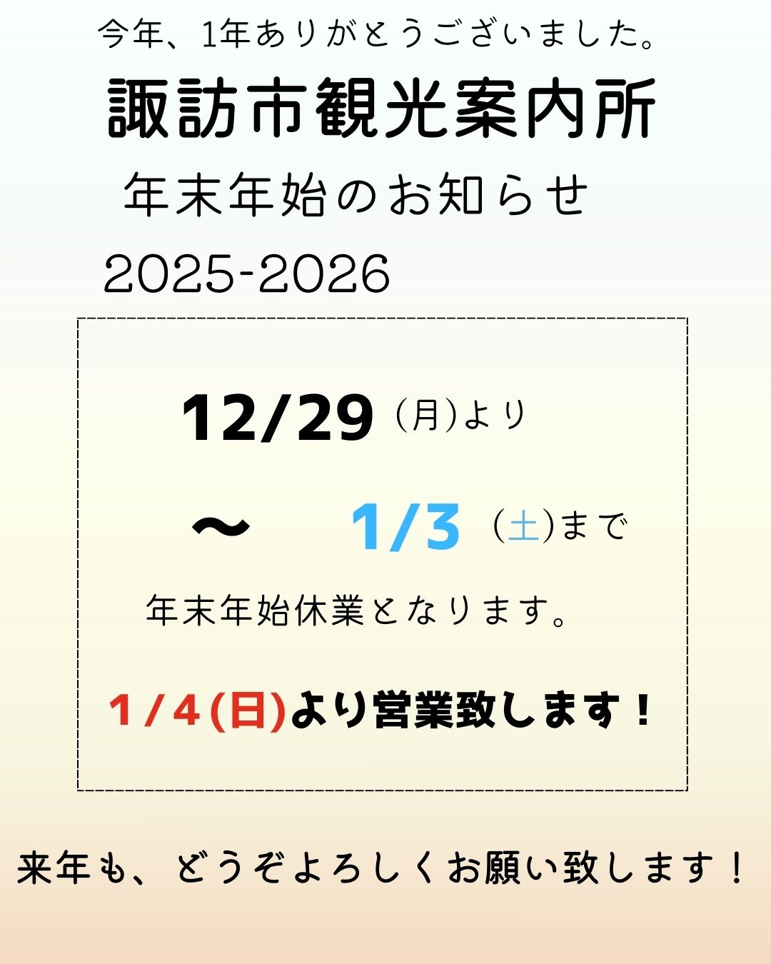 諏訪観光協会および、諏訪市観光案内所は、以下の日程で年末年始休業とさせていただきます。