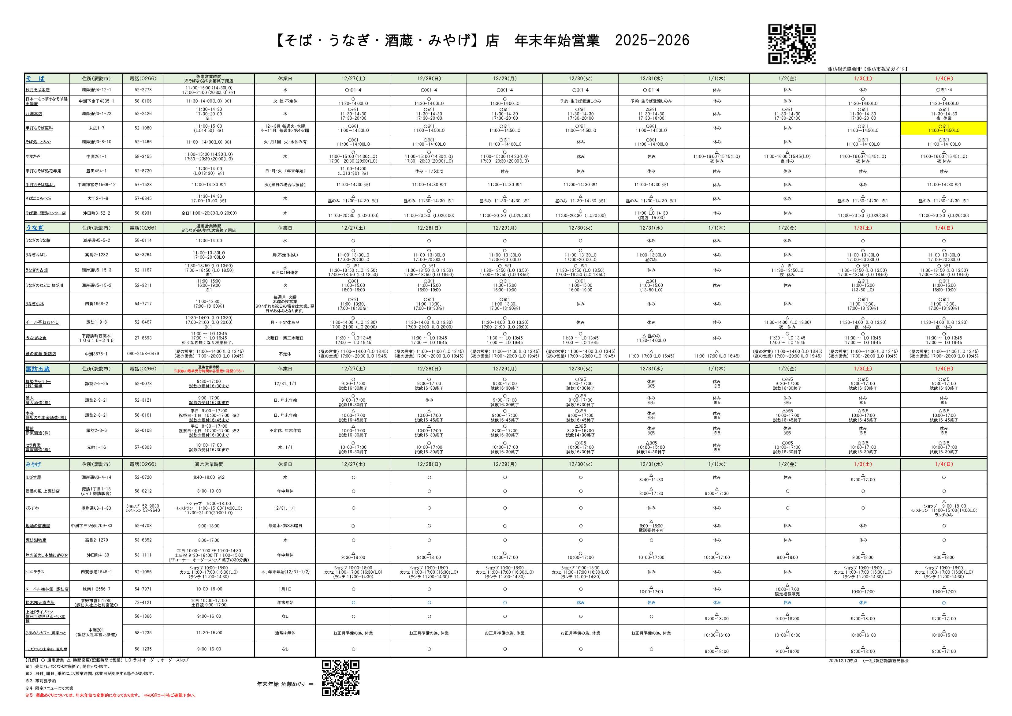 諏訪観光協会および諏訪市観光案内所の年末年始休業について(12月17日 現在)