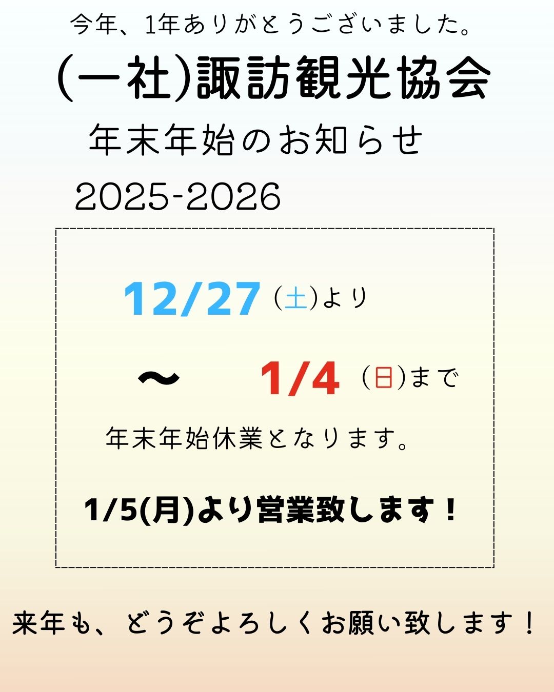 2025年12月27日(土)~2026年1月4日(日) 年末年始休業