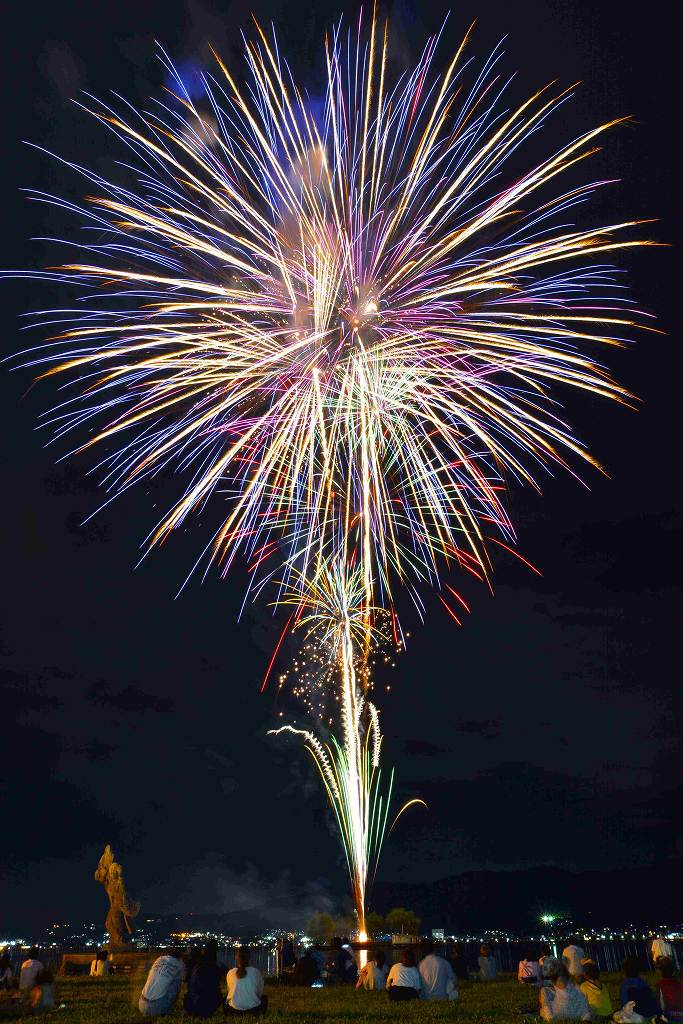 📍 諏訪湖上初島より4号・5号・7号玉の単発打上げ ※スターマインなし