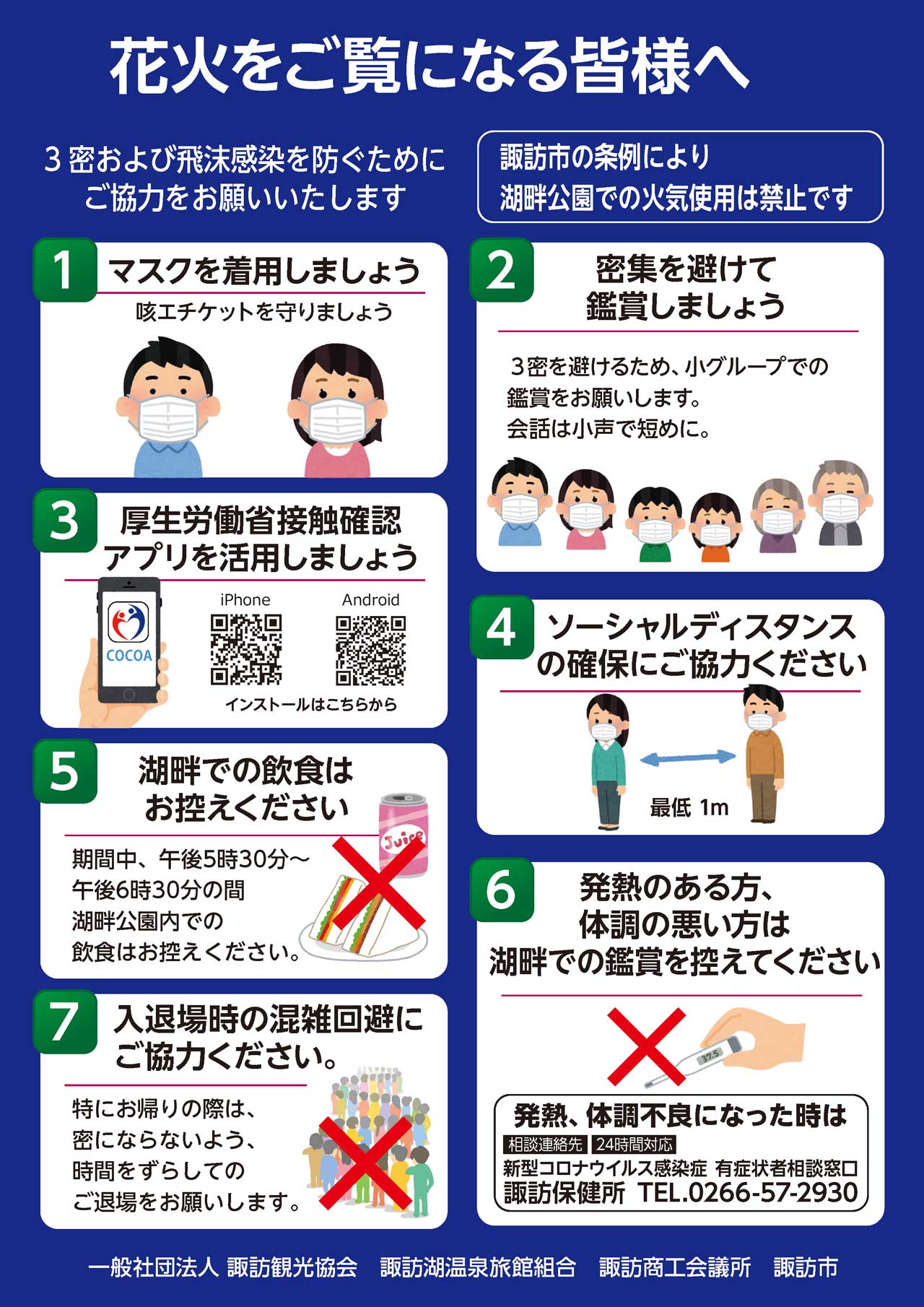 ・諏訪湖畔での鑑賞において、発熱や風症状のある方の参加自粛、3密の回避、手指消毒やマスクの着用にご協力をお願いします。