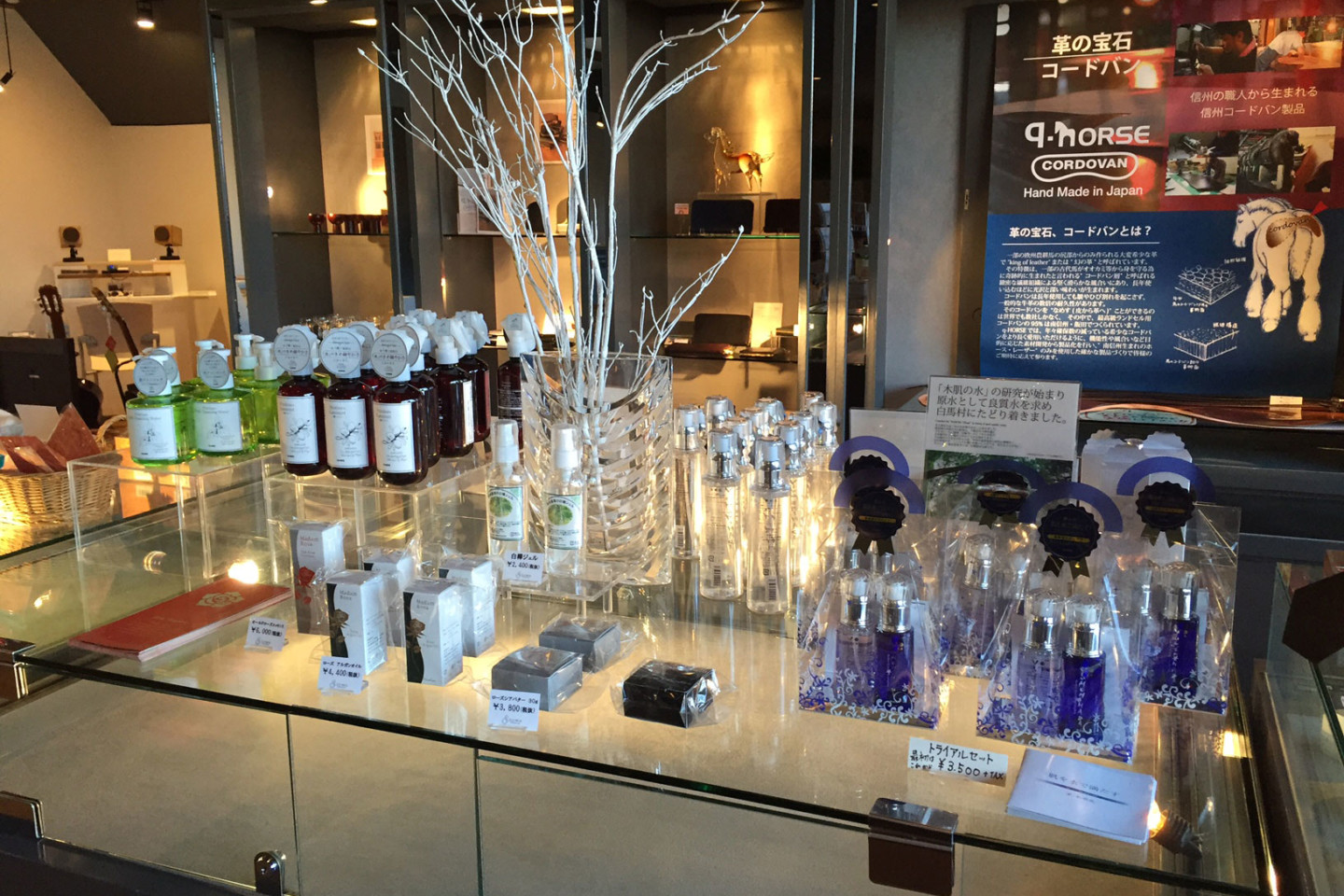 これも諏訪産だったのかと驚きの声が上がります。展示品は化粧品から楽器、