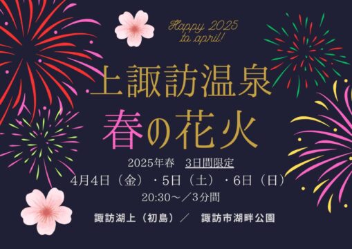 🌸桜の花咲く4月(卯月)🌸 上諏訪温泉では、春の信州旅行にあわせ3日間限定で花火を打ち上げます。夕食後のひととき、旅館ホテルの目の前からあがる春の花火をお楽しみください。 桜色の花火が観れるかも⁉知れません。   […]