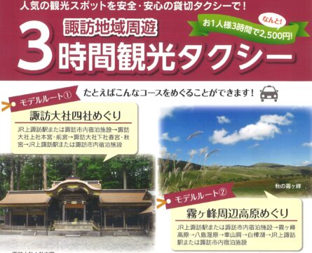 貸切観光タクシーを利用して、人気観光スポットをお得に巡れます! お一人様3時間でなんと!! 2,500円!! 諏訪湖周辺の美術館・博物館、御柱にまつわる見所(木落とし坂など)、 高島城、立石公園などなど、お問合せ、ご予約 […]